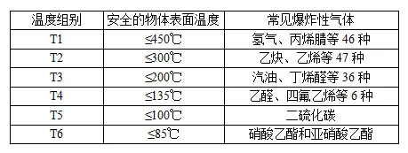 b、可燃性氣體、蒸氣的引燃溫度組別與電氣設備最高外表溫度組別逐個對應。