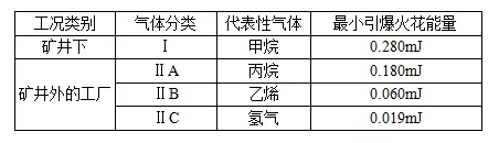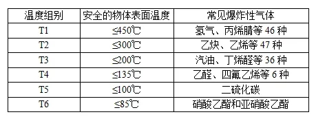 說明:a、可燃性氣體、蒸氣的傳爆等級也是電氣設備的防爆等級,兩者是共同的。b、可燃性氣體、蒸氣的點著溫度組別與電氣設備最高表面溫度組別一一對應。