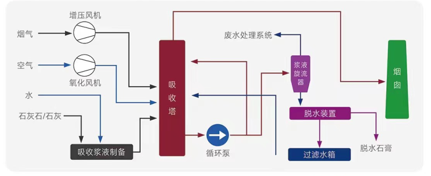 煙氣經(jīng)增壓風(fēng)機(jī)進(jìn)入吸收塔( 吸收塔底部為漿池),與來(lái)自循環(huán)泵送入的漿液接觸并被除去SO.。新鮮的漿液不斷地加入到吸收塔底部的漿池中。被洗滌后的煙氣經(jīng)塔內(nèi)除霧器除霧后進(jìn)入煙肉外排。空氣經(jīng)氧化風(fēng)機(jī)送入吸收塔底部的漿液中,將CaSO,強(qiáng) 制氧化成CaSO..通過(guò)循環(huán)泵將漿液送入獎(jiǎng)液旋流器,分離出獎(jiǎng)液中的水送入廢水處理系統(tǒng)漿液旋流器的底流進(jìn)入脫水裝置,經(jīng)脫水后即為脫水石膏。脫水裝置脫出的水,經(jīng)過(guò)濾后送入吸收塔回用。